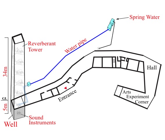 作者が独自開発した音具に対して、松之山の湧き水が水琴窟のような爽やかな音を創り出し、キョロロの塔の中を響き渡る。